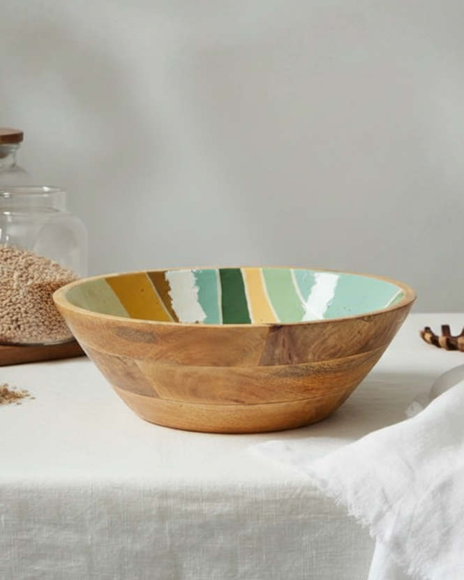 Designed for those who appreciate sustainable and ethical home accessories, this wooden bowl is crafted using responsibly sourced mango wood, a durable and eco-friendly material known for its rich grain and warm tones. The bowl is further elevated with a hand-enamelled abstract design, inspired by the natural beauty of leaves. The intricate details of this technique highlight the dedication of artisans who have mastered the age-old craft of enamelling.