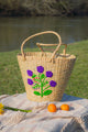 The beautiful floral design on the front is created using vibrant, eco-friendly materials, adding a cheerful and unique touch. Paired with sturdy bamboo handles, this bag is a perfect blend of nature-inspired elegance and functionality.