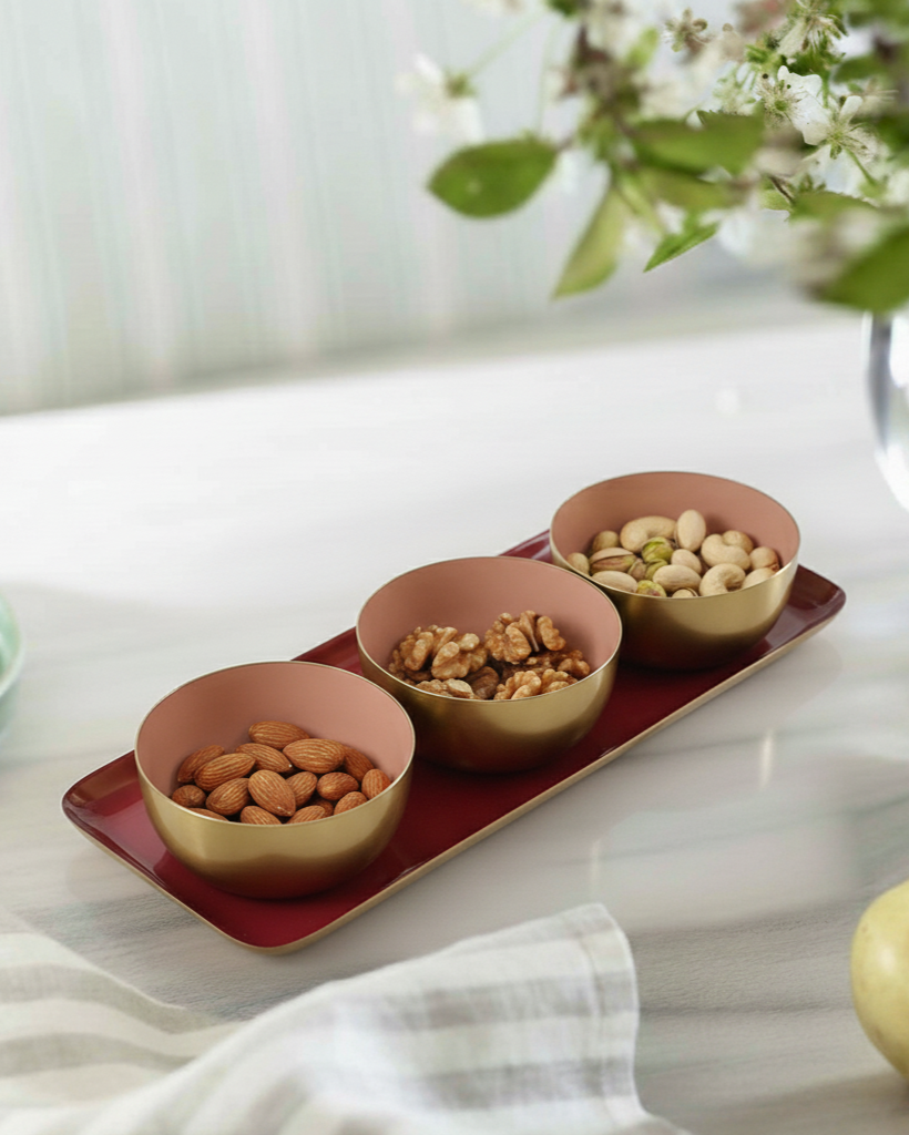 Elevate your kitchen and dining experience with this exquisite Enamelled Iron Tray with 3 Snack Bowls from Vayu Earth. A perfect blend of tradition and modern aesthetics, this handcrafted set brings artisanal craftsmanship to the forefront. Designed for those who appreciate fine detailing, this serveware set is ideal for presenting snacks, dips, and appetisers in an effortlessly stylish manner.