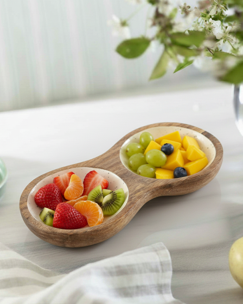 Designed for both practicality and aesthetics, this wooden double dip bowl is a must-have for any kitchen and dining space. The dual-section layout allows you to serve two complementary dishes at once, making it ideal for:
