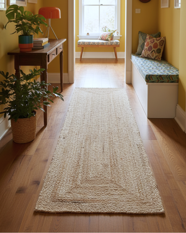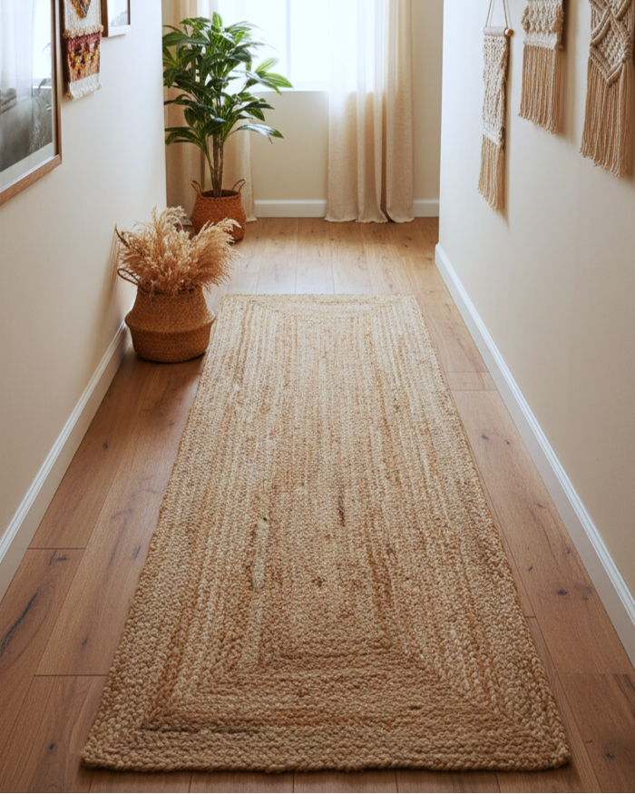 The Hand Braided Jute Earthy Long Rug is more than just a floor covering – it’s a versatile piece of home decor that complements any style. Its natural colour palette blends effortlessly with neutral tones and bold accents alike, making it a perfect fit for bohemian, Scandinavian, or contemporary interiors. Use it as a hallway runner, a kitchen rug to add warmth underfoot, or a centrepiece in your living room to anchor your decor.