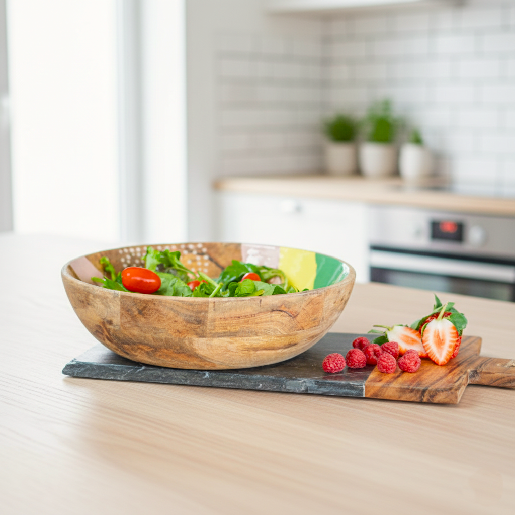 Each bowl is meticulously handmade by skilled artisans, preserving traditional woodworking techniques while embracing modern design sensibilities. Crafted from sustainable mango wood, this bowl showcases the beauty of natural wood grain, enhanced with vibrant, hand-painted abstract patterns. The intricate artistry is achieved through hand-painting, making every piece truly one of a kind.