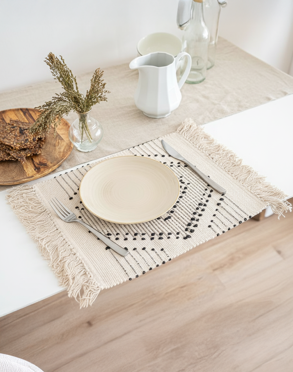 Whether paired with a cotton table runner for a coordinated look or used alone as a statement piece, these dining placemats bring effortless style to any meal. Their neutral tones and geometric detailing make them a versatile choice for formal dinners, casual brunches, or everyday dining.