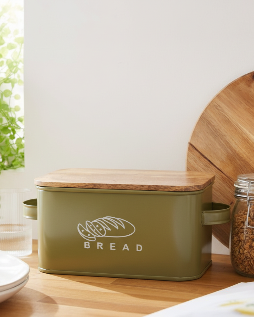 Bring elegance and functionality to your kitchen with this light green metal bread box featuring a beautifully crafted mango wood lid. Designed for modern kitchens, this artisan-crafted storage box provides an air-tight solution to keep your bread, fruits, cereals, and spices fresh while adding a sophisticated touch to your space.