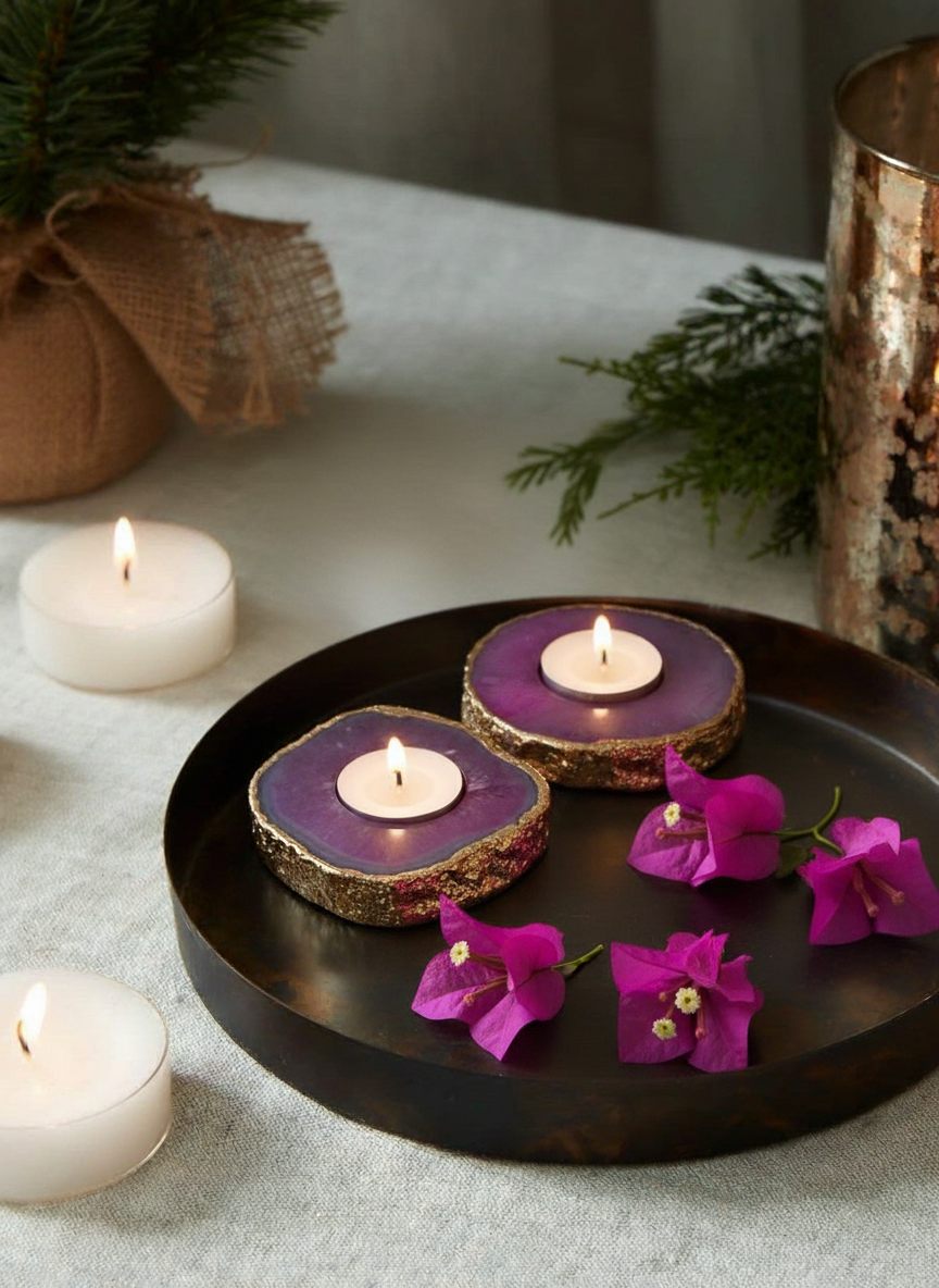Elevate your home décor with this exquisite set of Purple Agate Gemstone Tea Light Holders, handcrafted by skilled artisans in Jaipur, Rajasthan – a city celebrated for its gem-cutting heritage. Each holder is meticulously shaped from natural agate stone, polished to reveal its unique banded patterns, and finished with a shimmering gold outline for a luxurious touch.