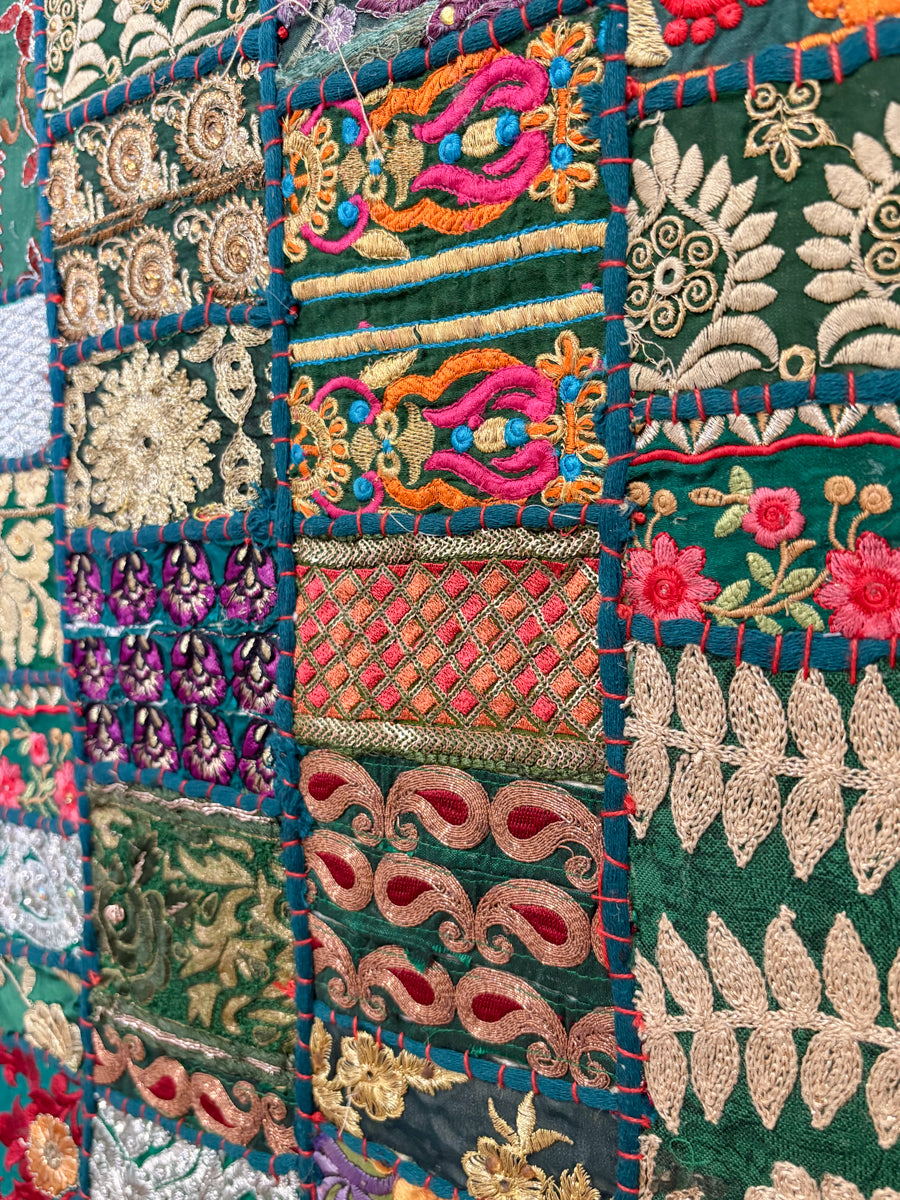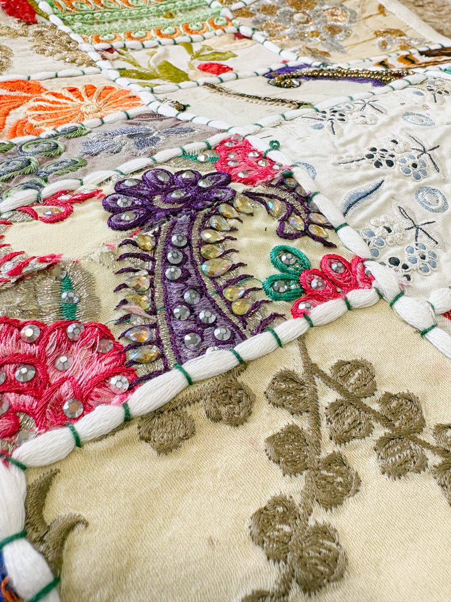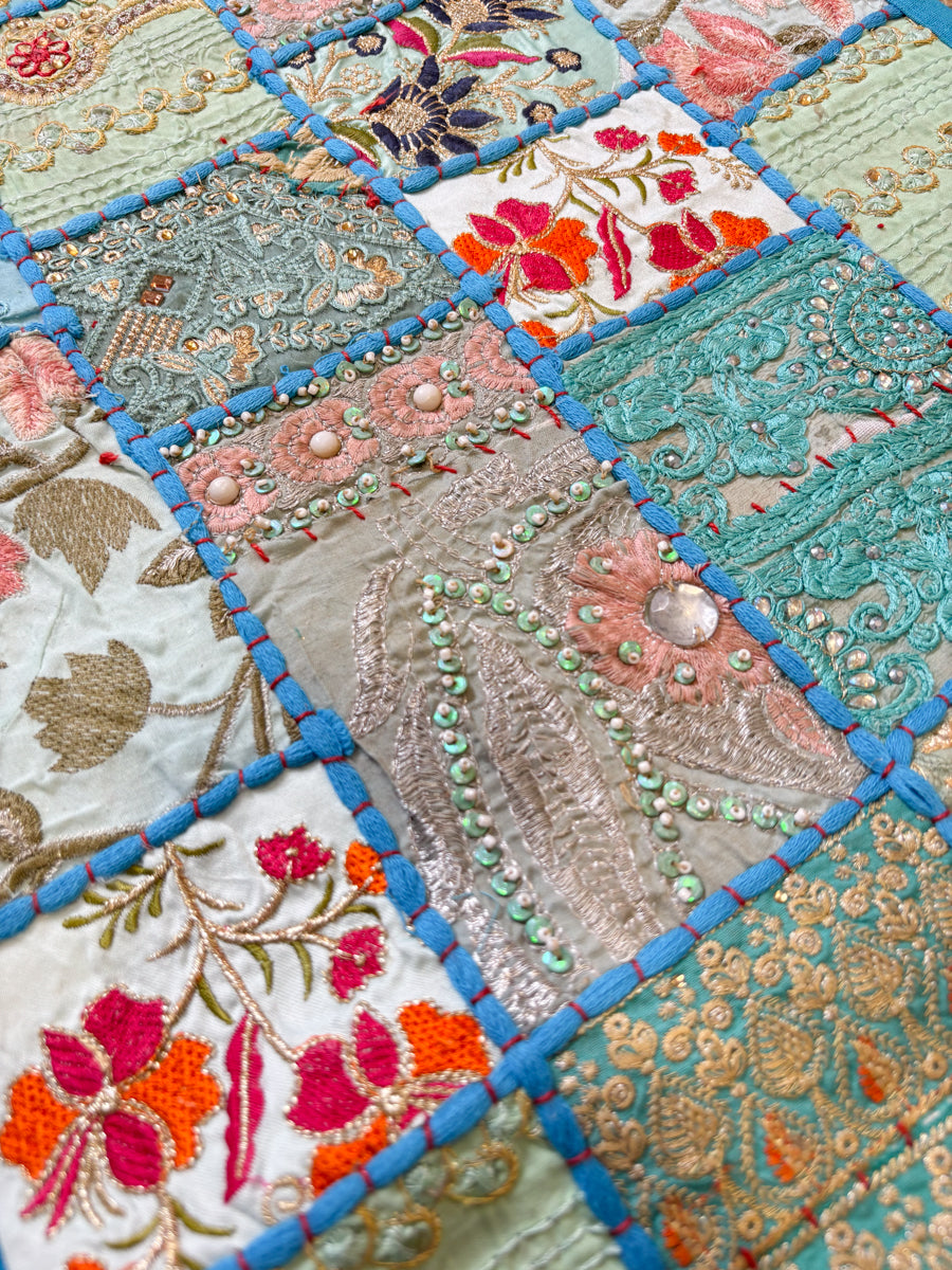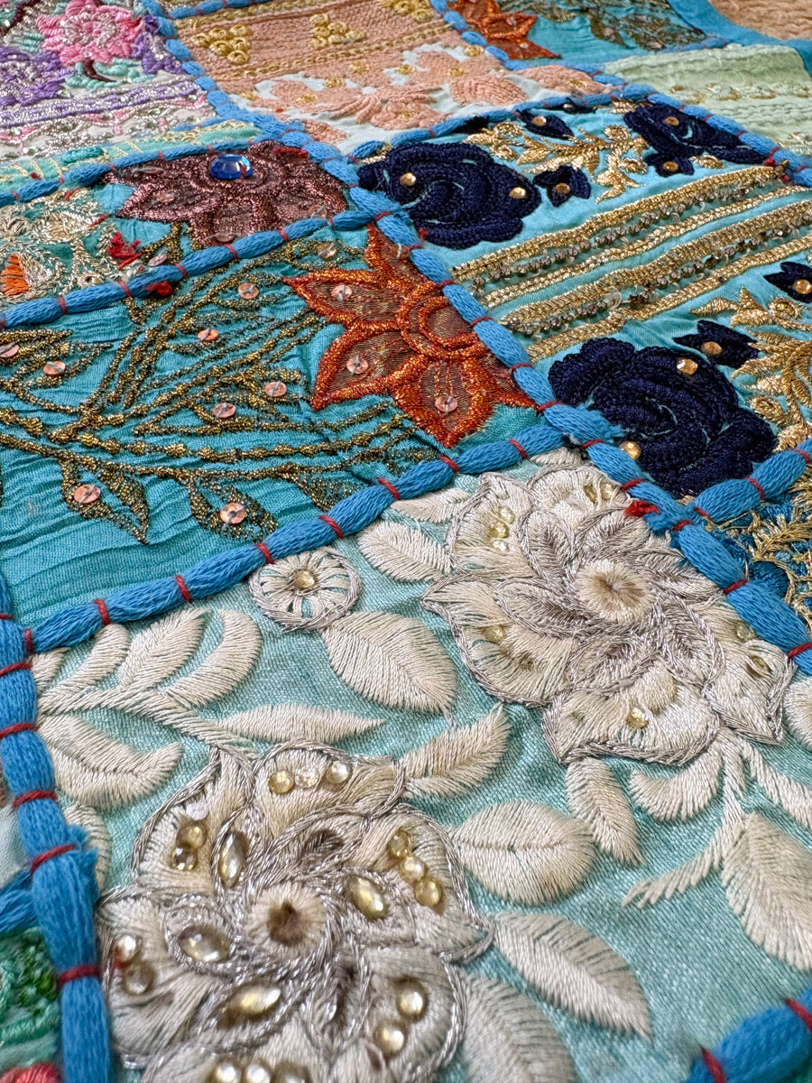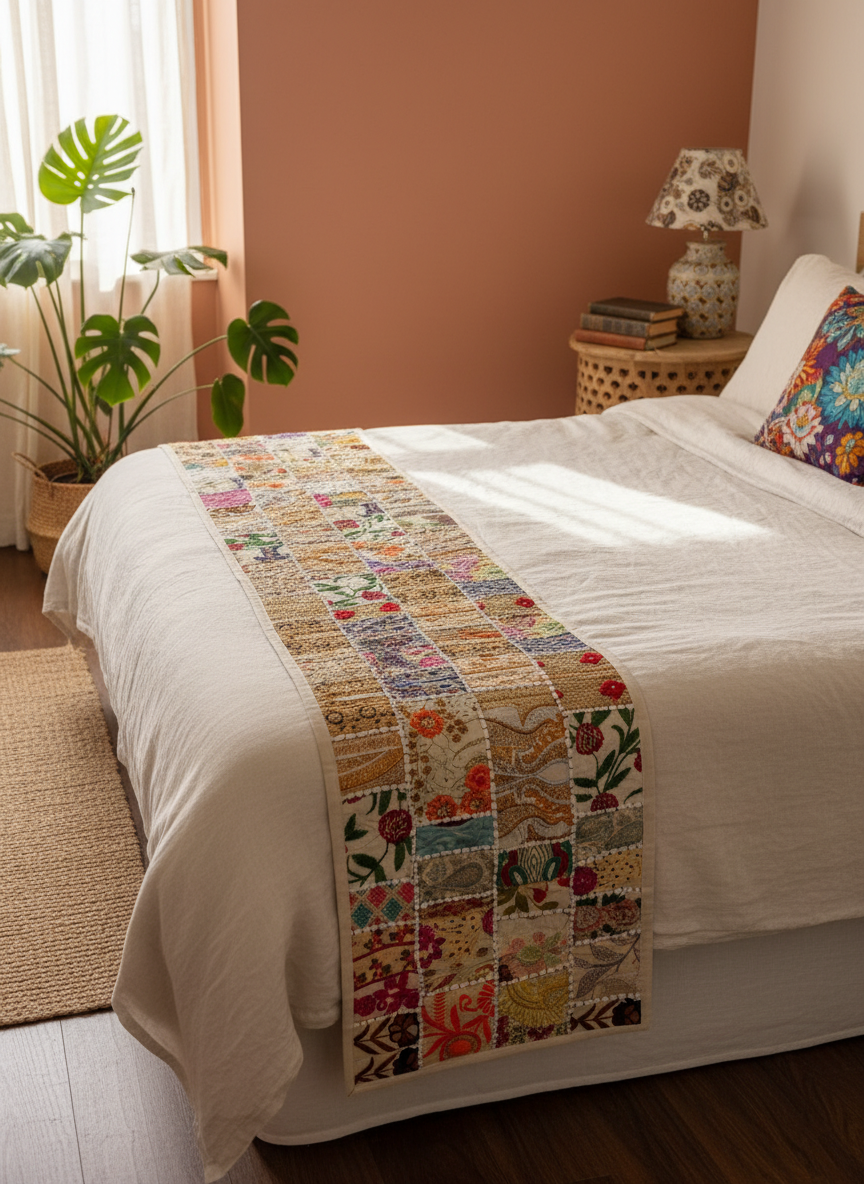 Handcrafted by skilled artisans in Jaipur, India, this bed runner showcases the intricate art of patchwork — a heritage technique passed down through generations. Carefully selected surplus cotton and silk fabrics are stitched together to create a richly textured design, where every panel tells its own story. No two runners are ever the same, making each piece truly one of a kind.