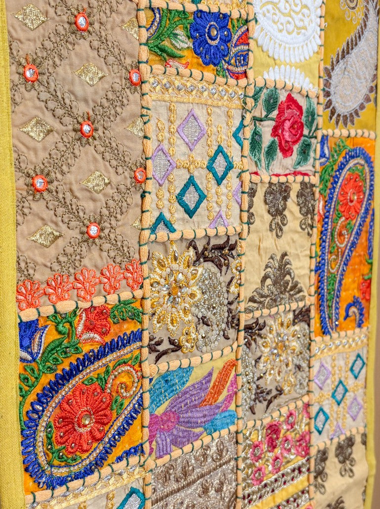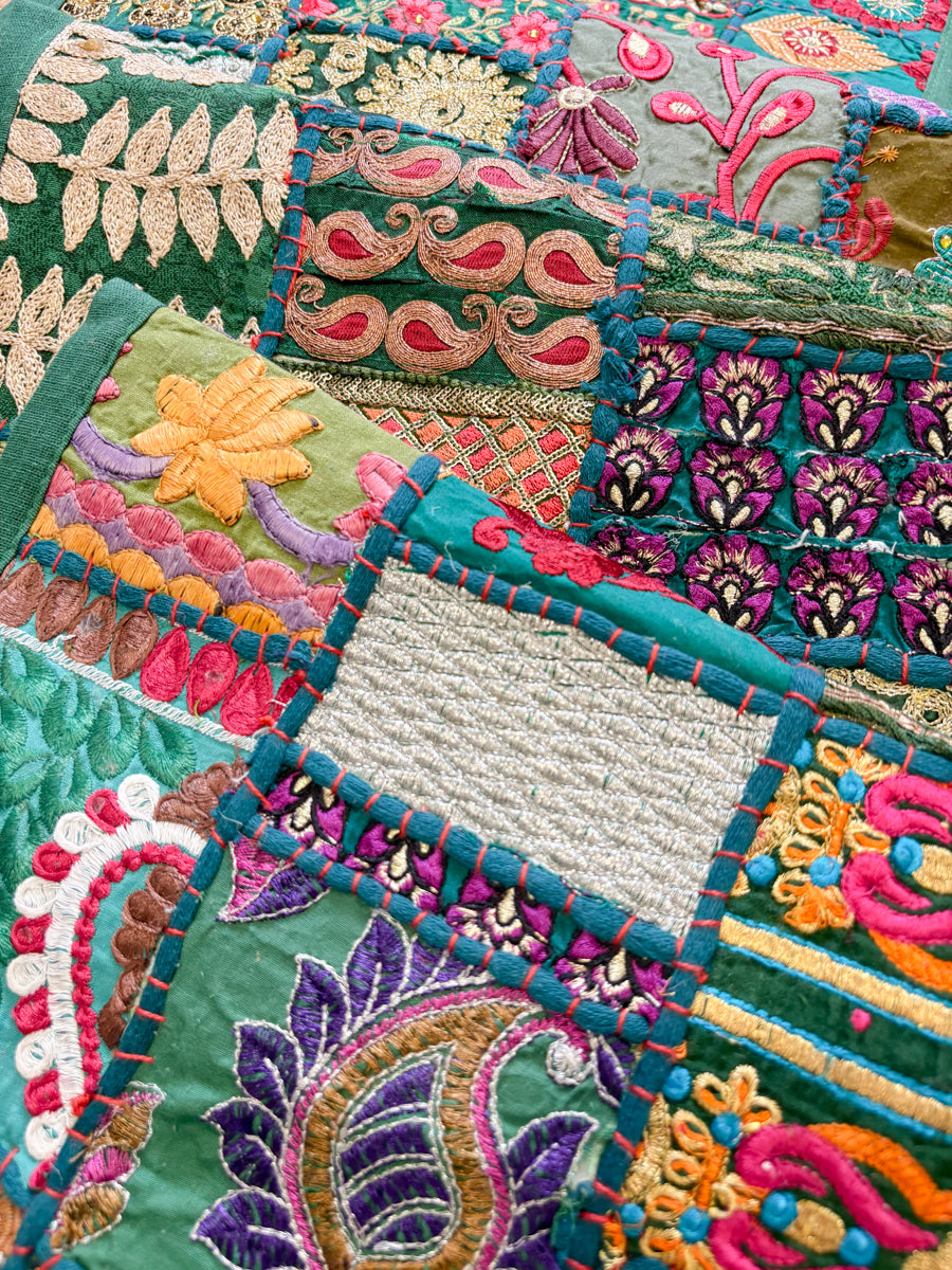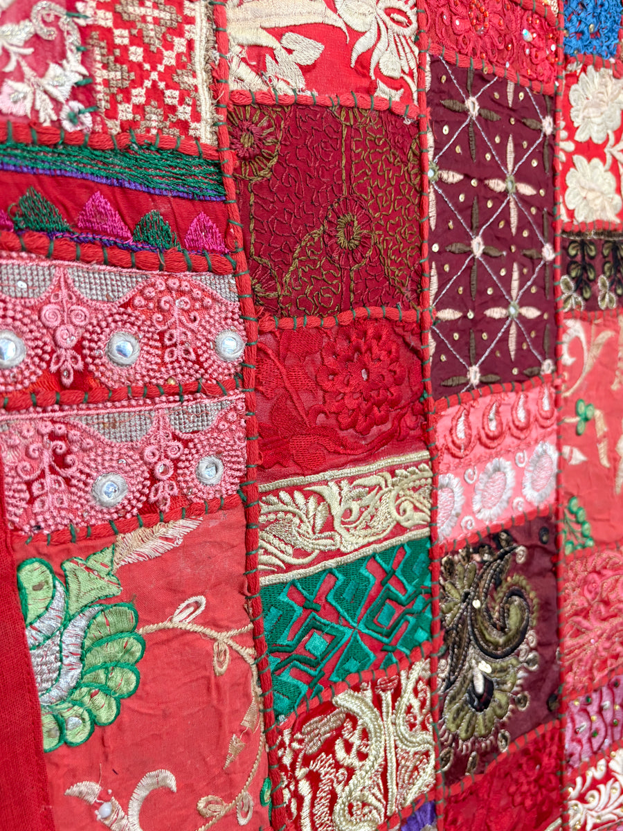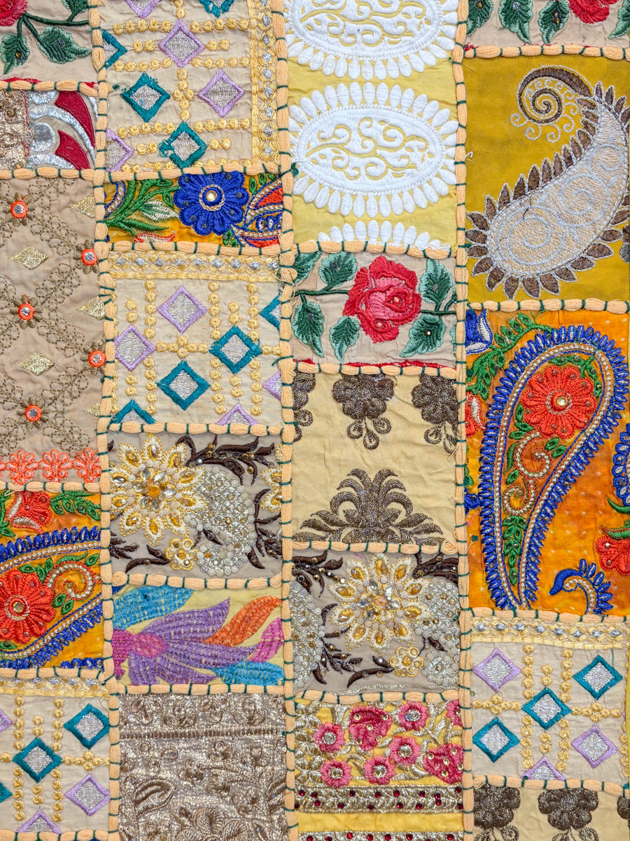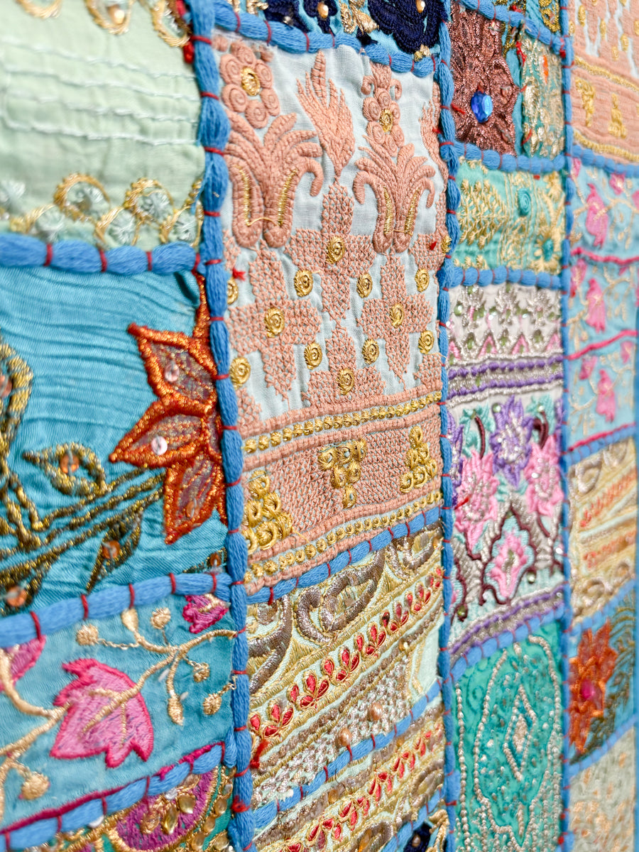 Handcrafted by skilled artisans in Jaipur, India, this bed runner showcases the intricate art of patchwork — a heritage technique passed down through generations. Carefully selected surplus cotton and silk fabrics are stitched together to create a richly textured design, where every panel tells its own story. No two runners are ever the same, making each piece truly one of a kind.