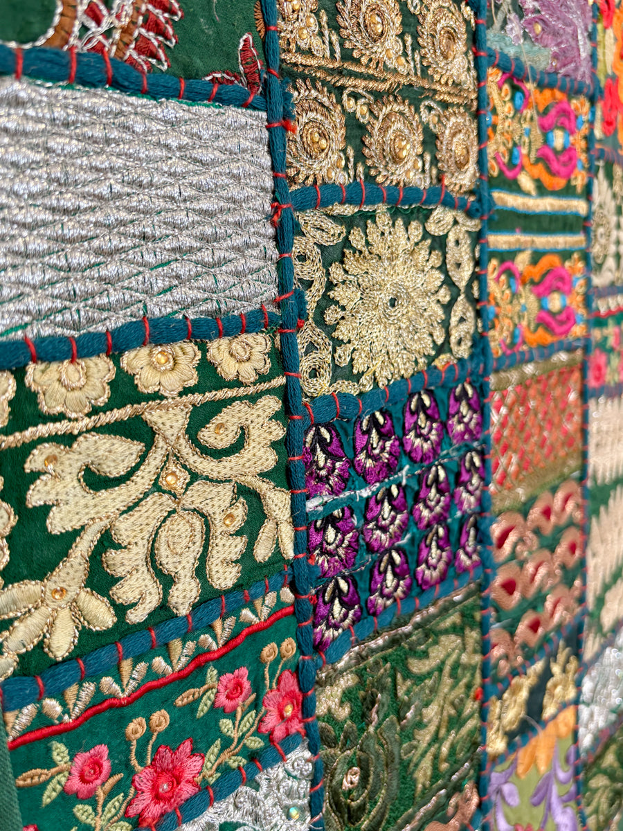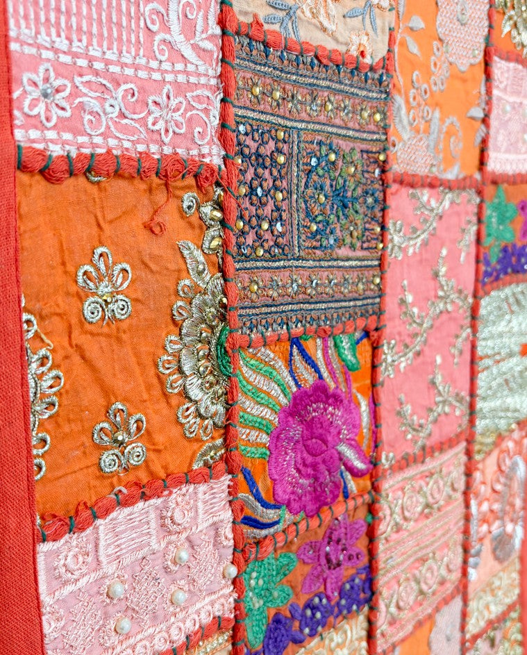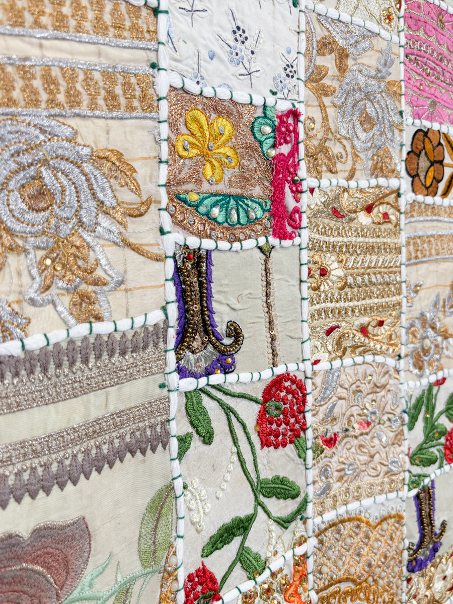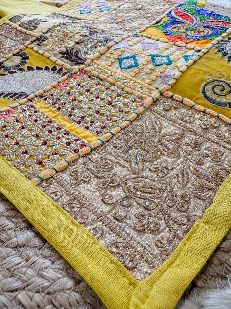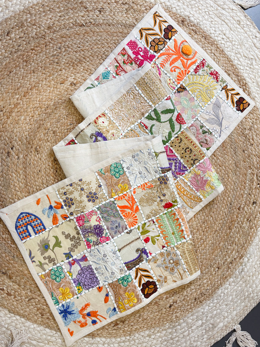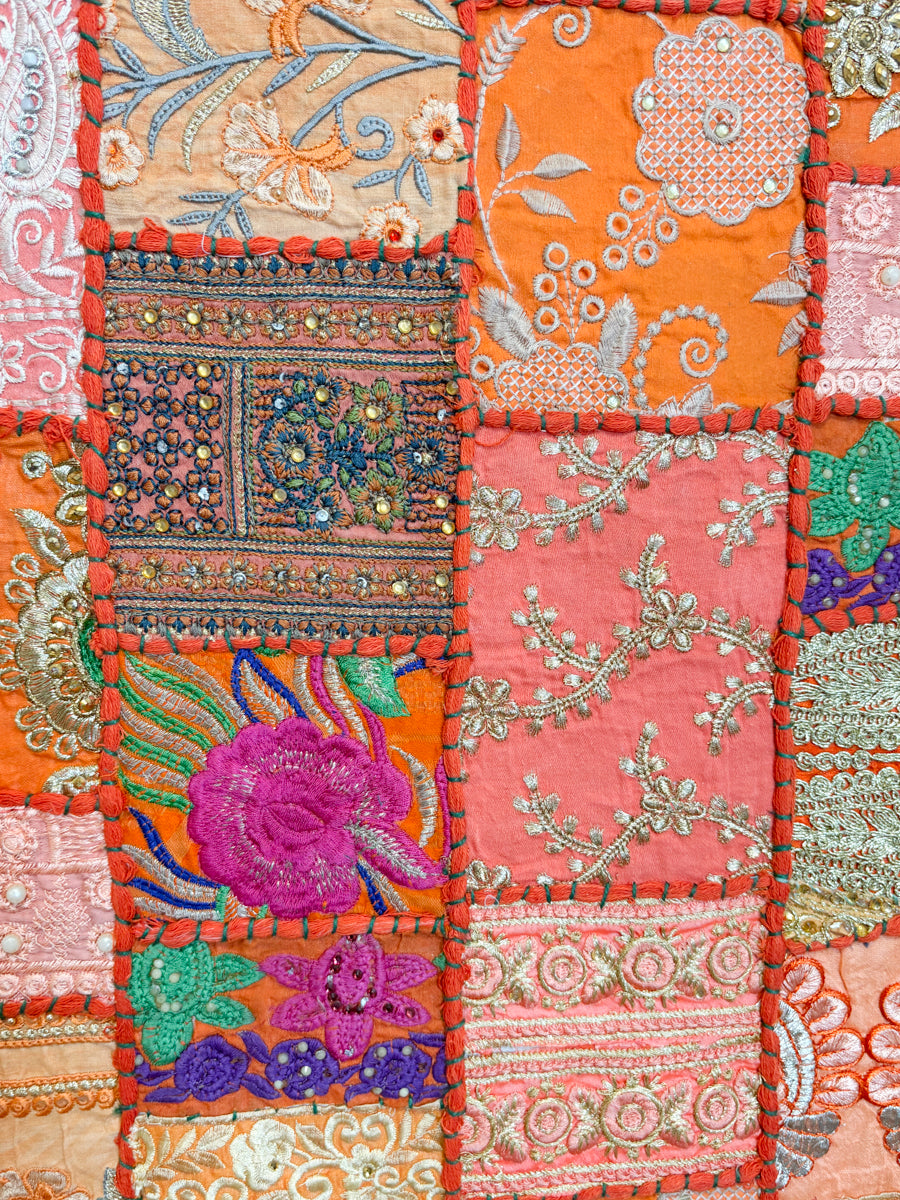Handcrafted by skilled artisans in Jaipur, India, this bed runner showcases the intricate art of patchwork — a heritage technique passed down through generations. Carefully selected surplus cotton and silk fabrics are stitched together to create a richly textured design, where every panel tells its own story. No two runners are ever the same, making each piece truly one of a kind.