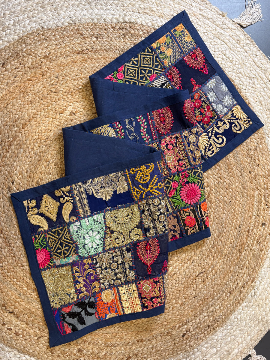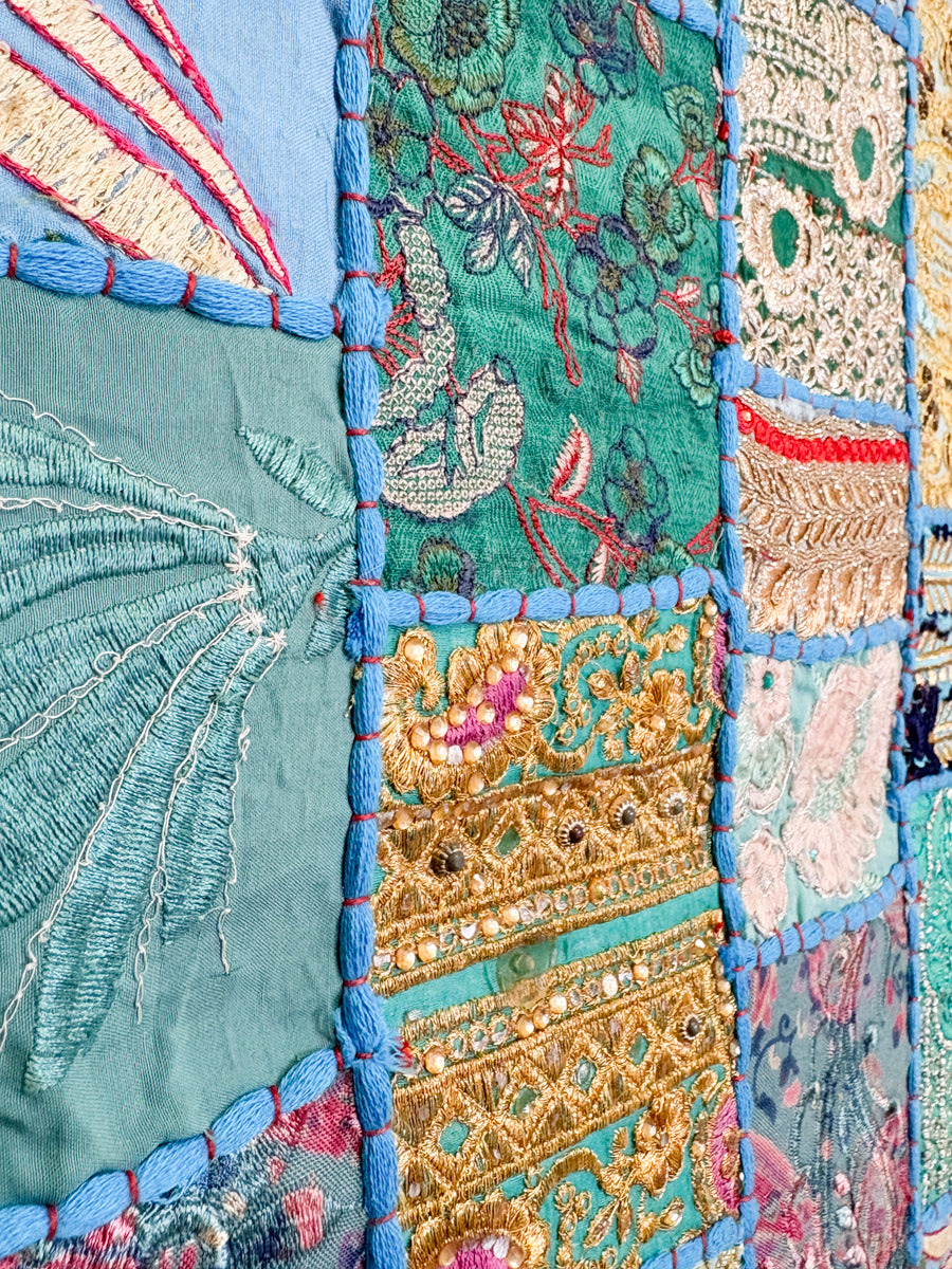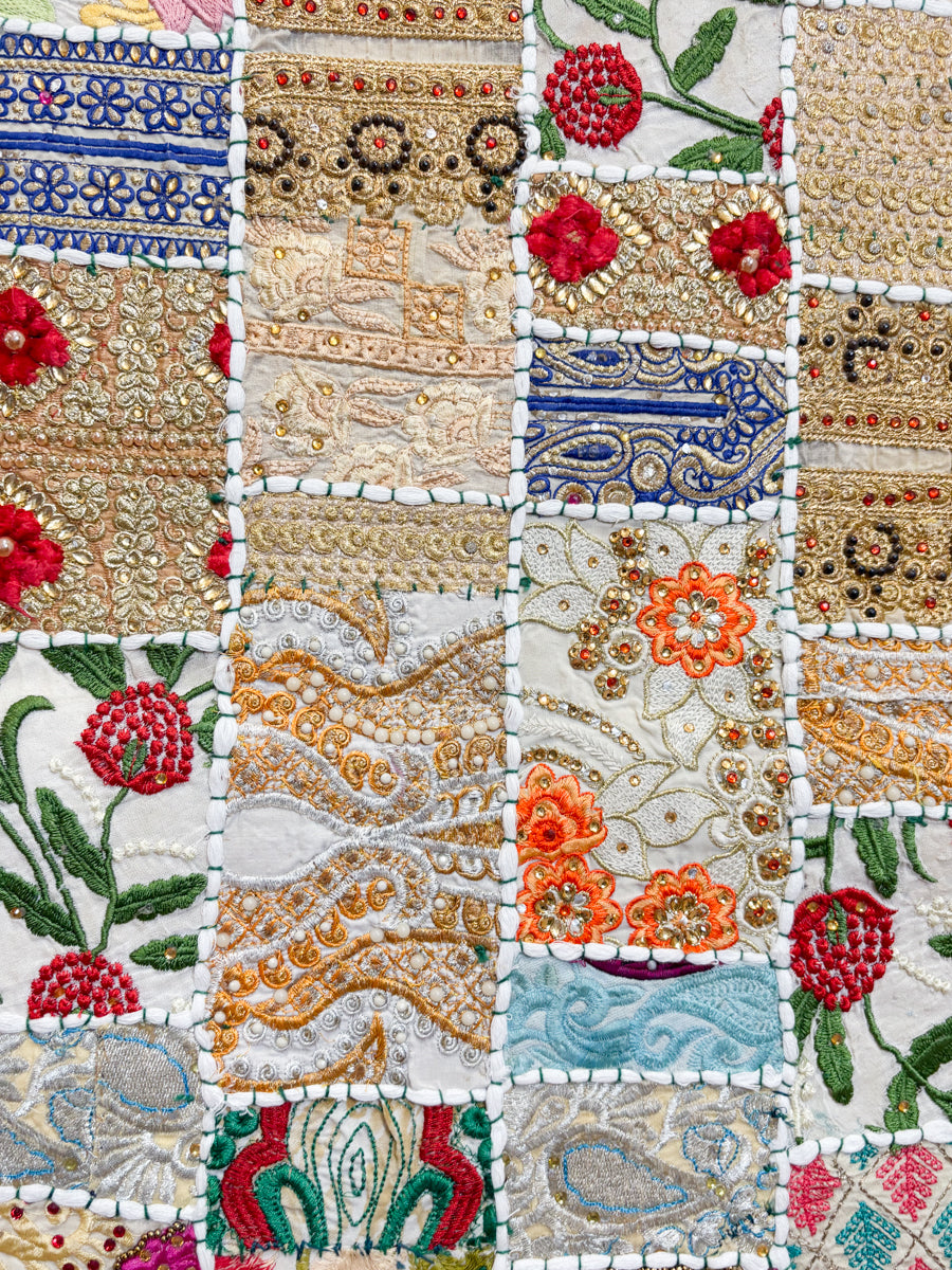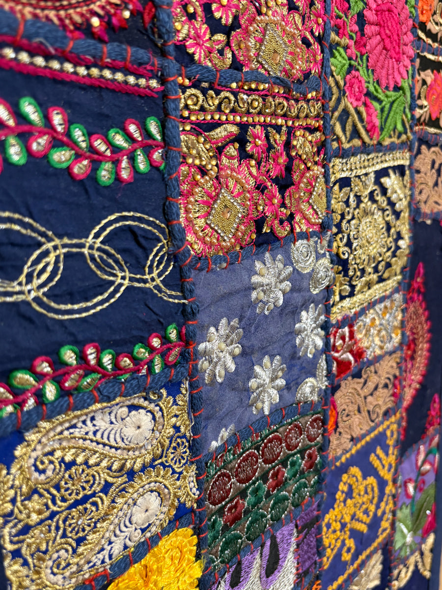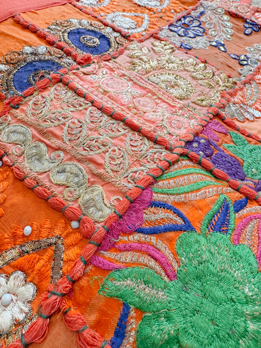 Handcrafted by skilled artisans in Jaipur, India, this bed runner showcases the intricate art of patchwork — a heritage technique passed down through generations. Carefully selected surplus cotton and silk fabrics are stitched together to create a richly textured design, where every panel tells its own story. No two runners are ever the same, making each piece truly one of a kind.