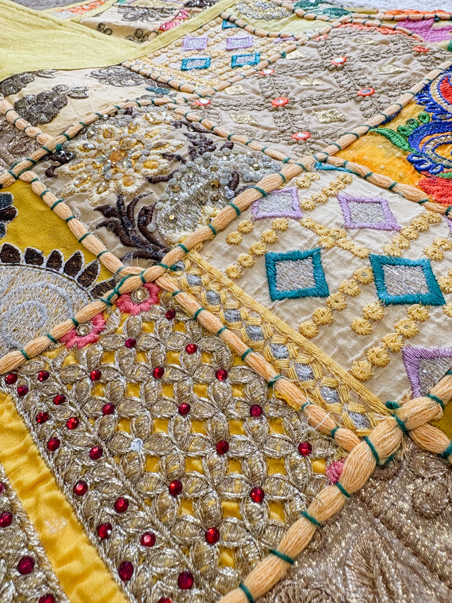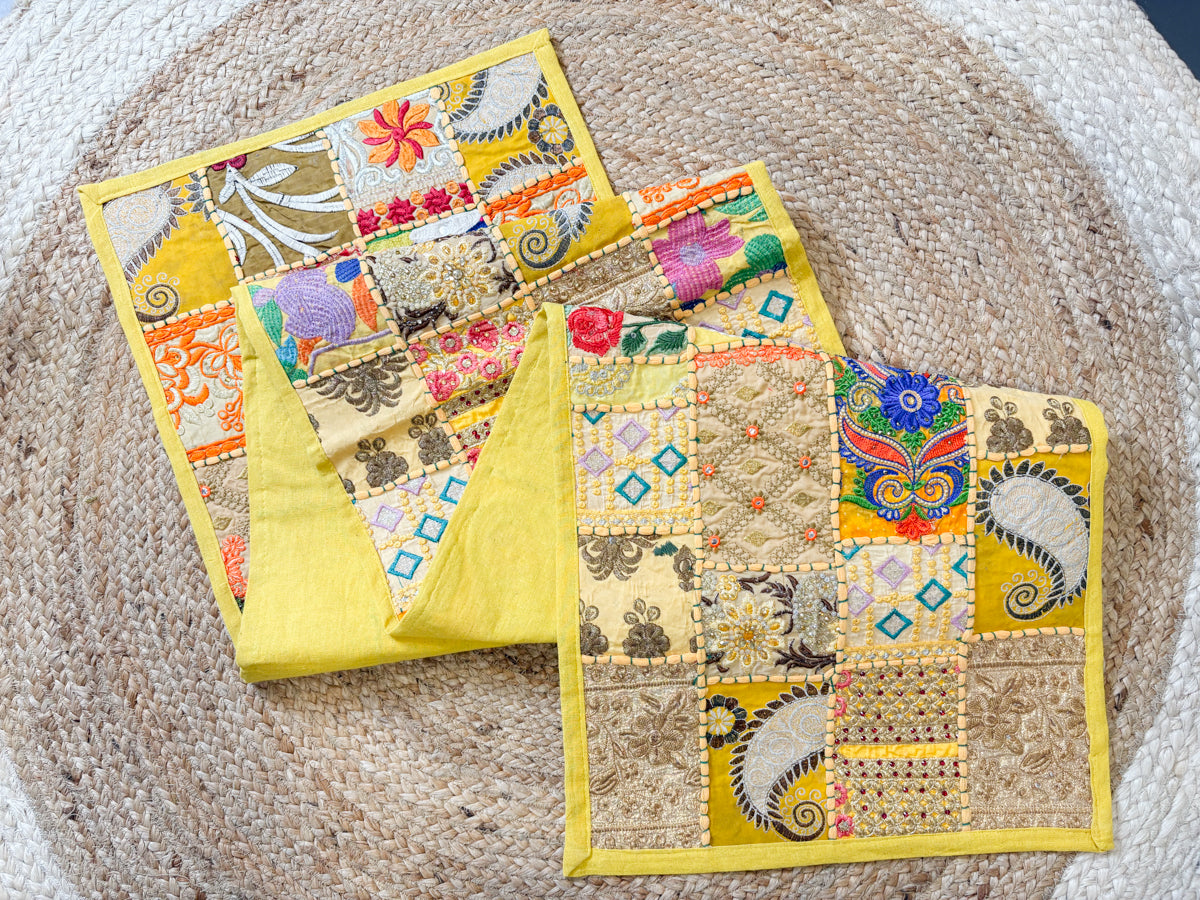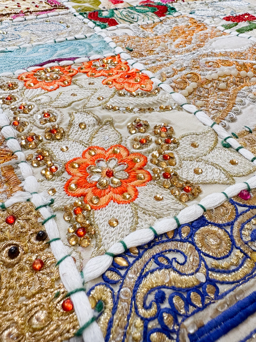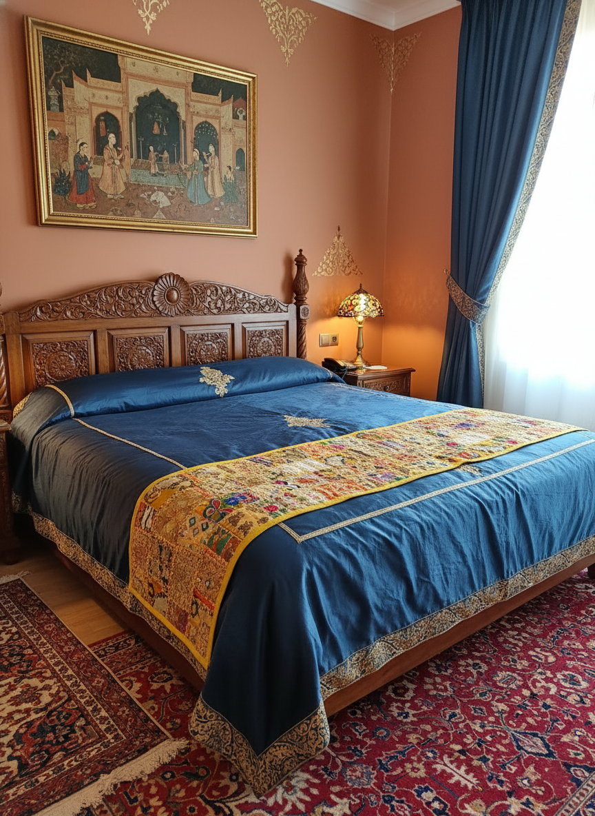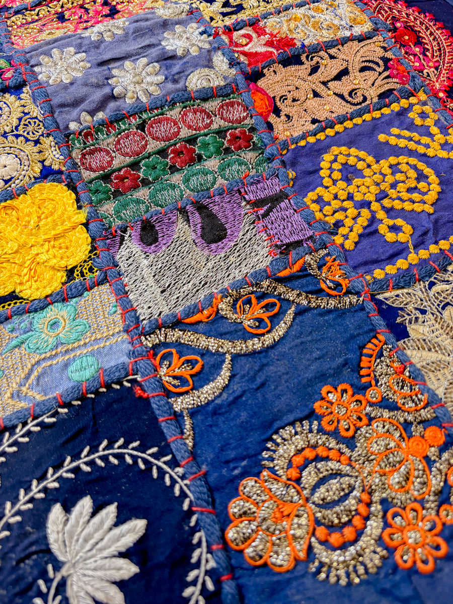 Handcrafted by skilled artisans in Jaipur, India, this bed runner showcases the intricate art of patchwork — a heritage technique passed down through generations. Carefully selected surplus cotton and silk fabrics are stitched together to create a richly textured design, where every panel tells its own story. No two runners are ever the same, making each piece truly one of a kind.