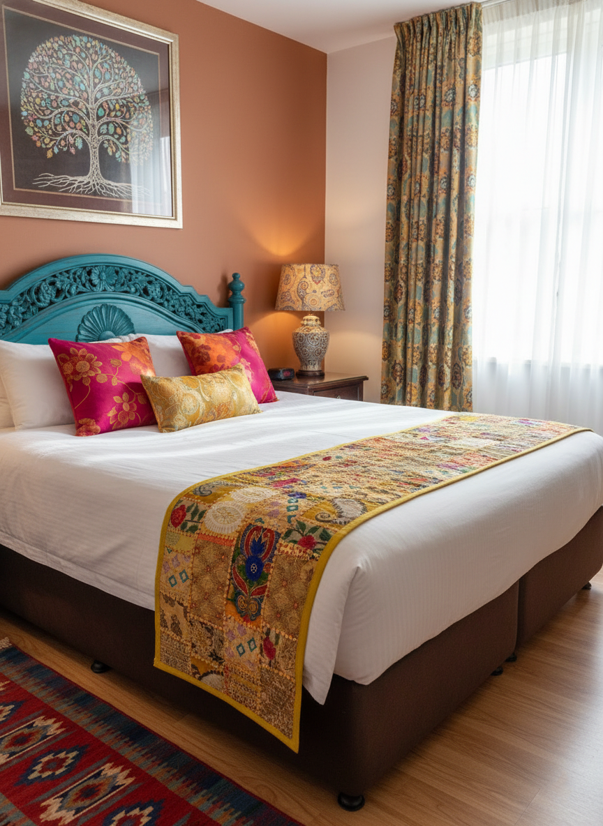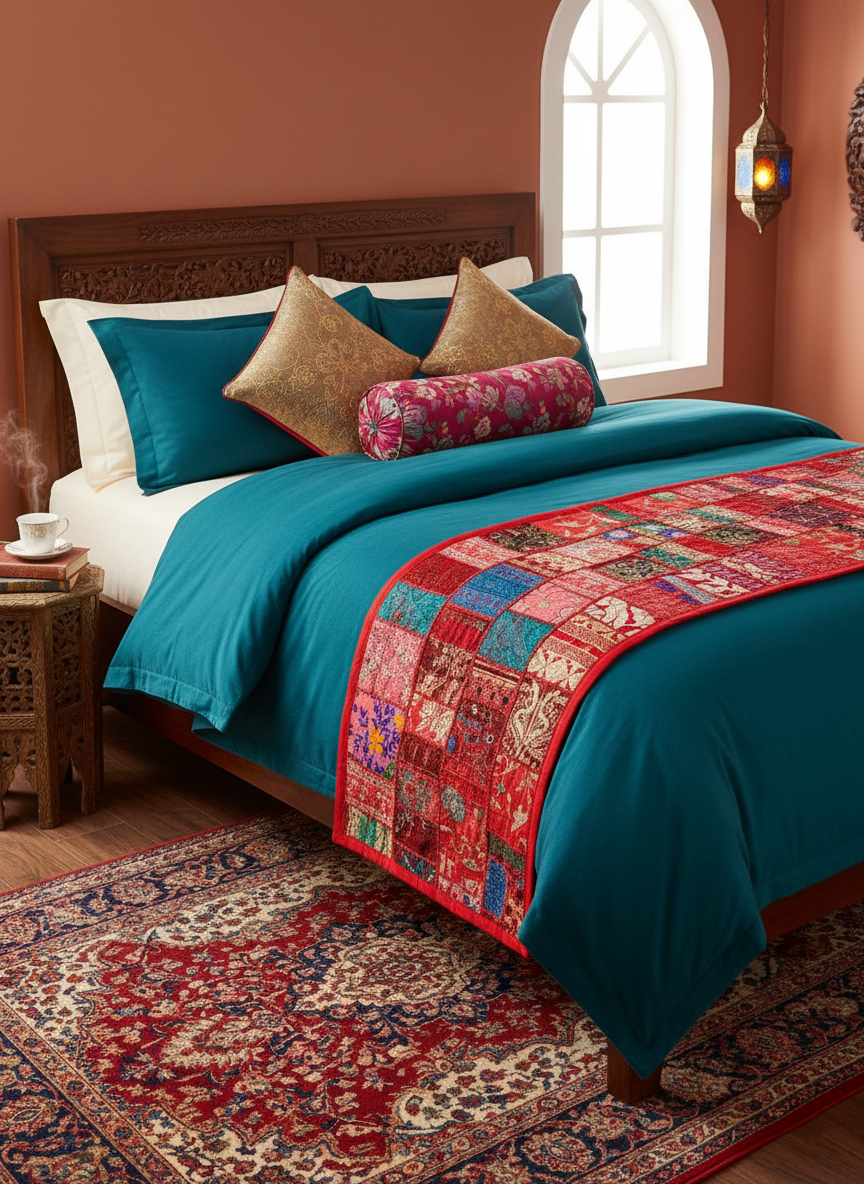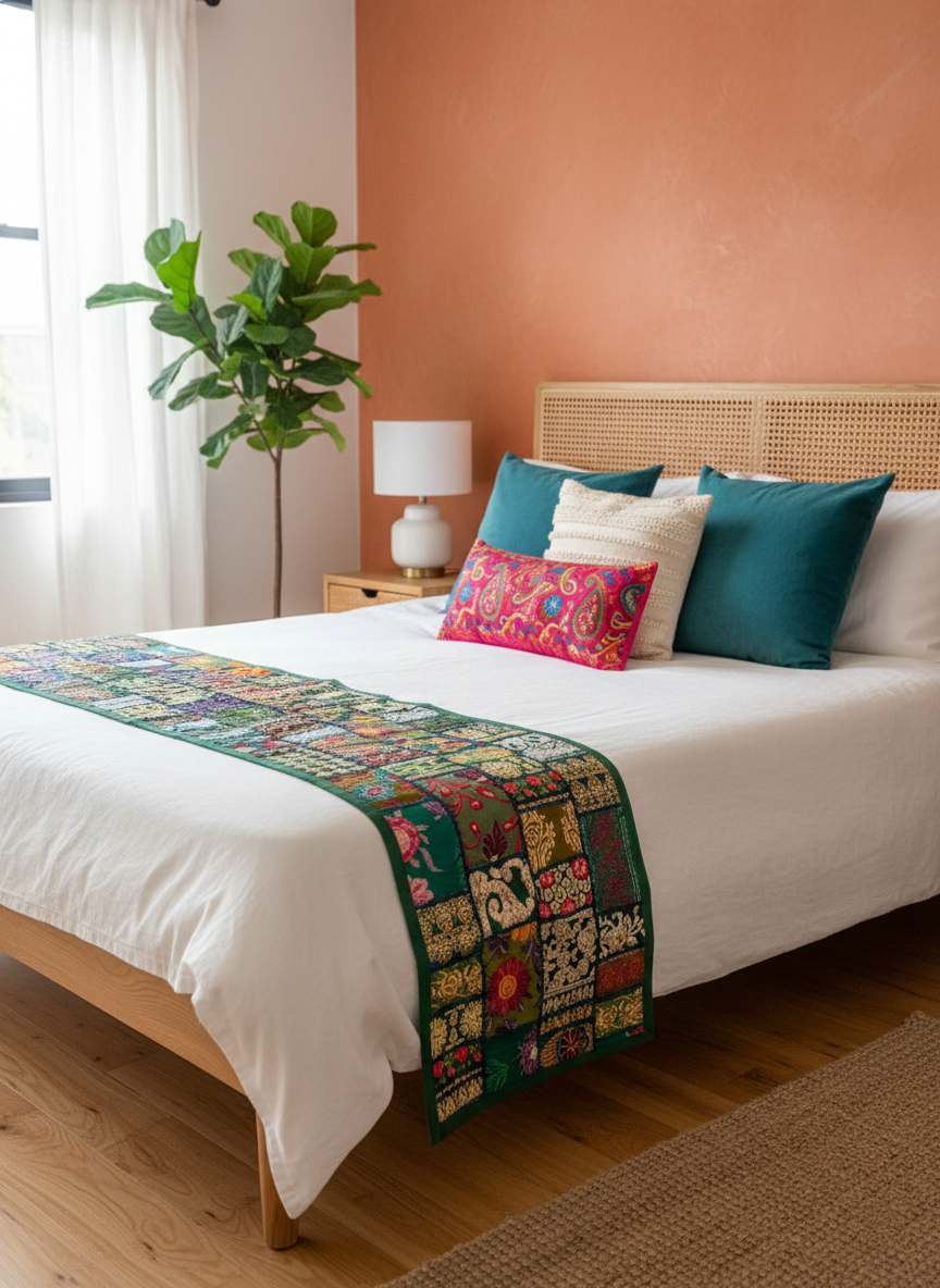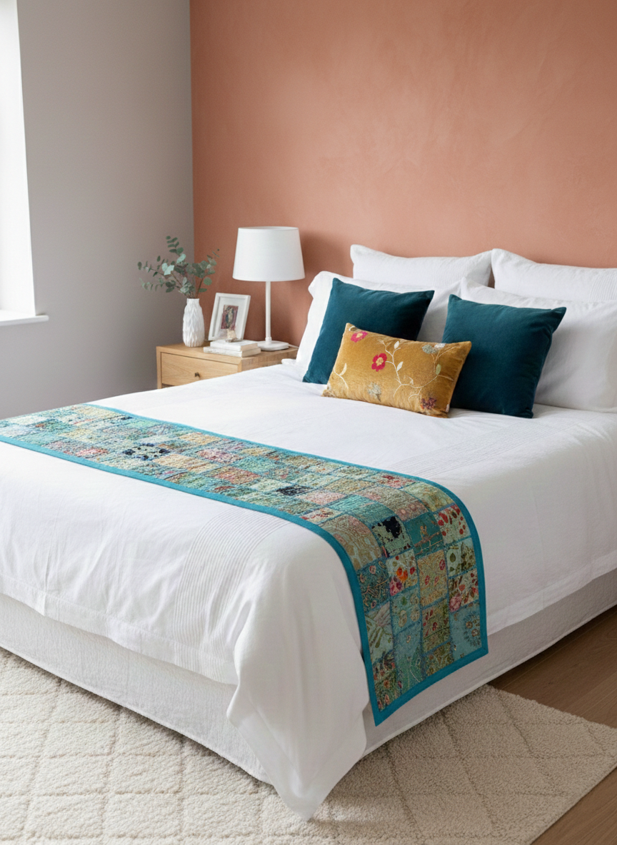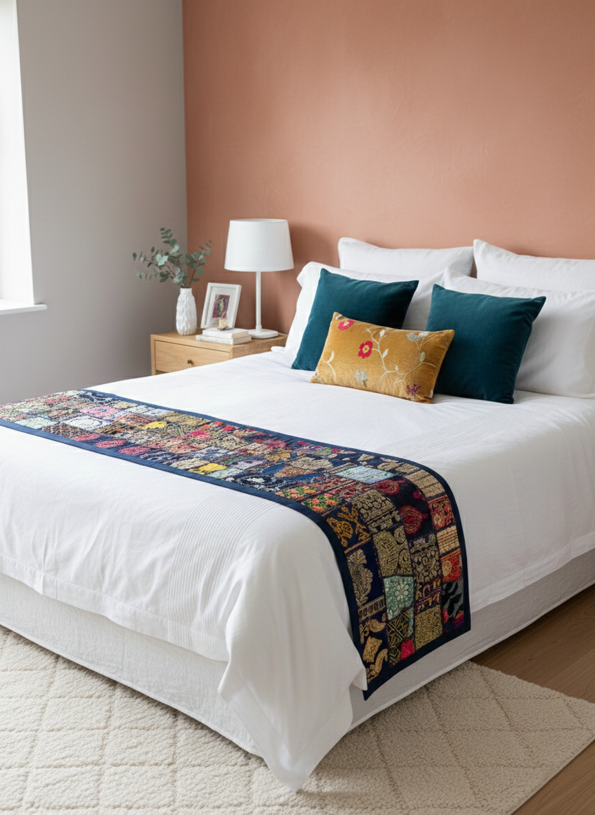 Whether draped across the foot of your bed or layered over a sofa or daybed, this patchwork runner adds depth, colour, and a sense of artisanal luxury to both modern and bohemian interiors.