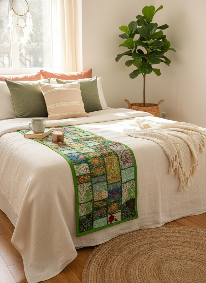Bring warmth, texture, and character to your bedroom with this beautifully handcrafted patchwork bed runner from Vayu Earth. Made from reclaimed cotton and silk textiles, this piece is a celebration of traditional craftsmanship, sustainable design, and timeless style.